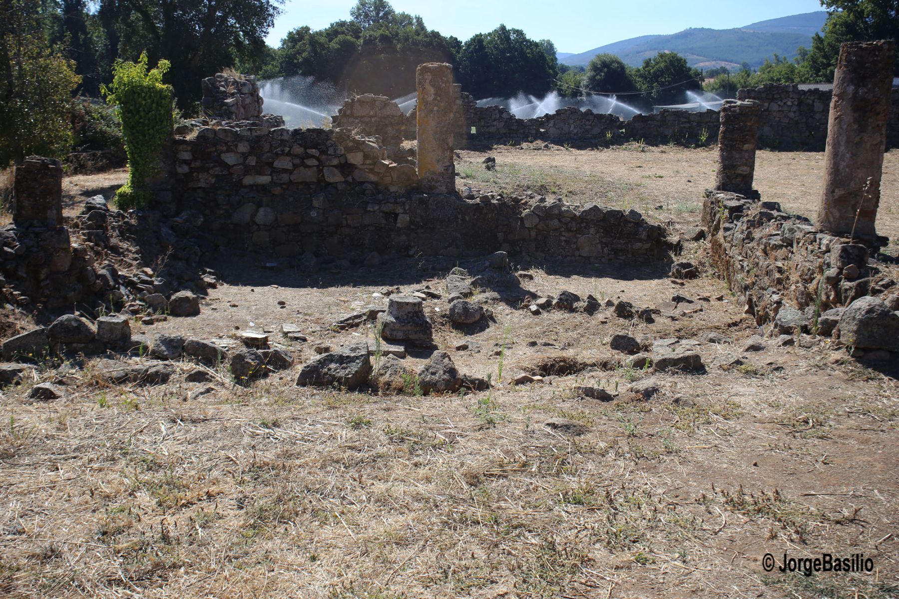 [mais informação] [para cima] [voltar] [localização]""Em local pouco elevado, mas dominando visualmente a paisagem a sul, até Beja, instalou-se em época romana, no séc. I d. C., uma villa, centro de uma exploração agrícola: aí poderia residir o proprietário, organizavam-se os trabalhos necessários à produção, armazenavam-se e transformavam-se os produtos da terra que lhe pertencia. Foi no decurso deste período, até ao século IV, que a “casa” da primeira instalação se foi progressivamente monumentalizando, tendo passado por duas grandes campanhas de obras. A primeira, no século II, mais tímida, vinca o carácter “urbano” da residência, e a segunda, nos meados do século IV, denuncia uma ruptura com o modelo arquitetónico seguido no decurso dos séculos anteriores: a tradicional casa de peristilo, fechada sobre si mesma e centrada sobre um ou mais pátios interiores, substitui-se por uma arquitetura aberta ao exterior, de desenvolvimento linear, em que as fachadas são valorizadas, pela multiplicação dos vãos, como elemento de ligação entre os espaços interiores e o exterior. São desta fase os vestígios que, ainda hoje, e conservando apenas parte do piso térreo, testemunham a grandiosidade e opulência de uma época que se aproximava do seu fim." (Fonte: DGPC)"[mais informação] [para cima] [voltar] [localização]